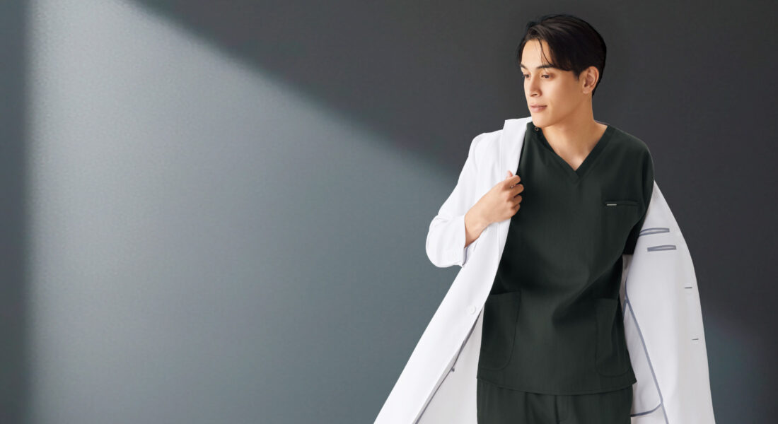 クラシック・スーツの定番柄をスクラブに。ウール調の仕立てた風合いは本物志向の方へおすすめ