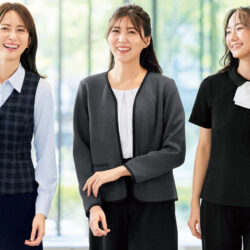 ベスト×スカートの落ち着いたなかにも華やかさが感じられるユニフォームは「ホテルのコンシェルジュのよう」と好評です。ホワイト×チャコールのベストはほどよくフィットし、ポケットのパイピング のリボンがワンポイント。細見えするシルエットが完成します。
