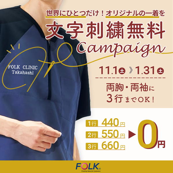 フォークオンラインストアで販売中の白衣アイテムに、文字刺繍を無料で入れられる、期間限定のキャンペーンです。