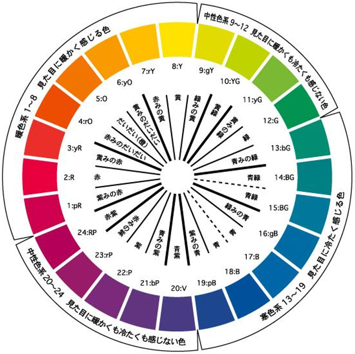 一方、ピンクやオレンジなどの暖色系の色は、「親しみやすさや温かみを感じさせるため、介護施設や小児科、美容クリニックなどで人気があります。」と記載しています。」この文章を色相環に当てはめて理解すると、複数個の具体的な色が提示され、自分の目で確かめながら自分が納得できる好きな色を選ぶことができるようになります。