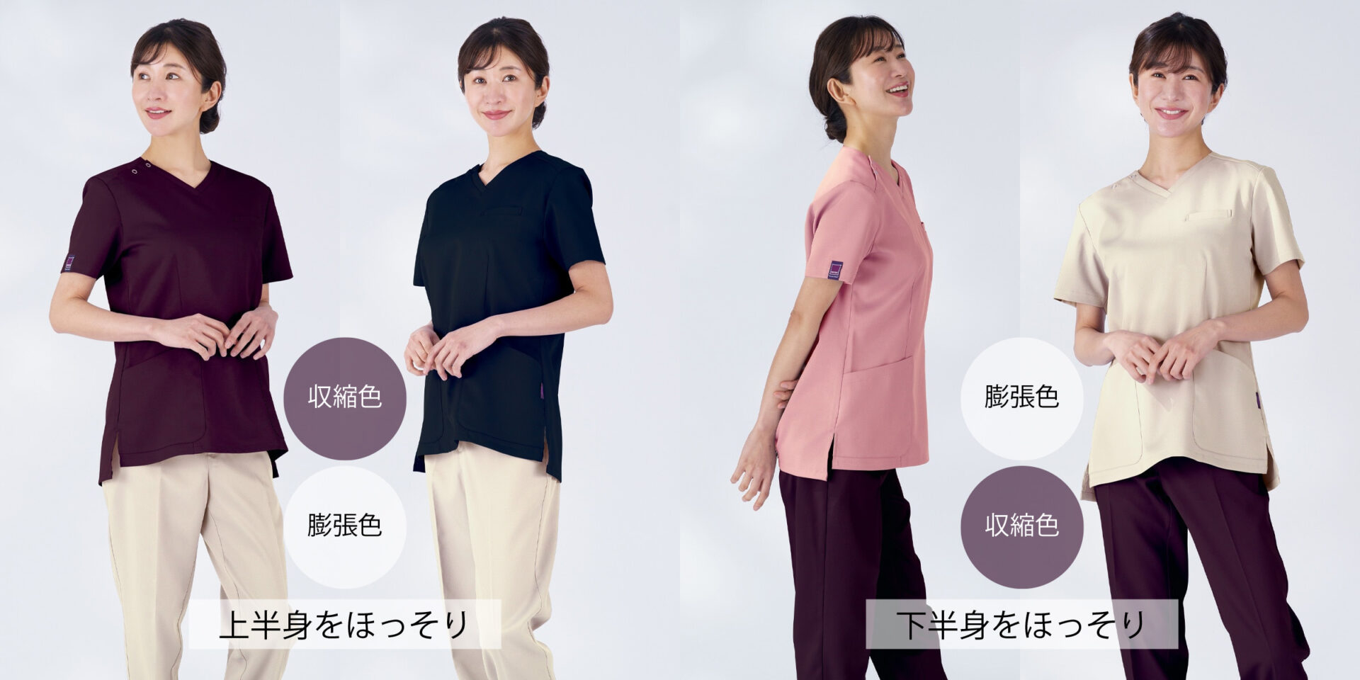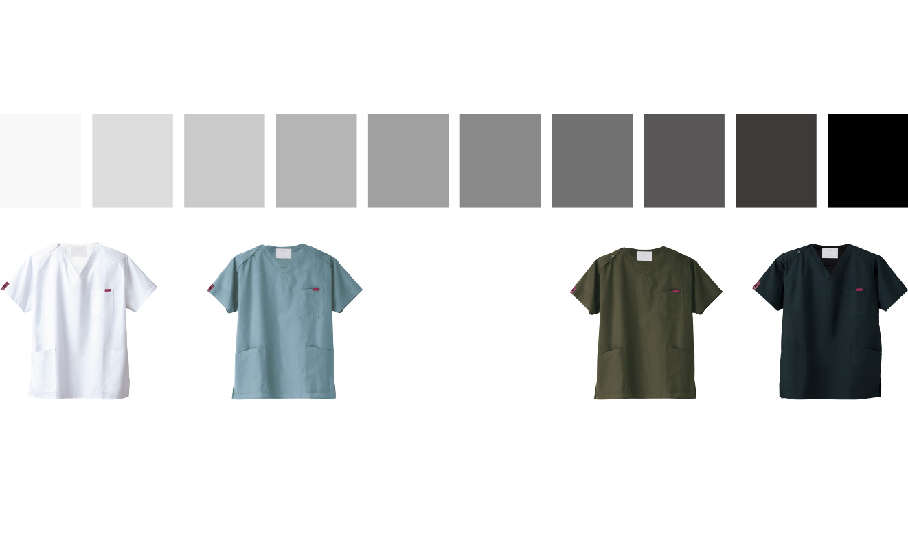 後編では、今回紹介した色相環の基礎知識ををもとに、汗ジミが目立たない複数の色群、ブラなどの下着が透けて見えにくい複数の色群、医療従事者としてふさわしい複数の色群、肌の色と調和する複数の色群について紹介していきます。