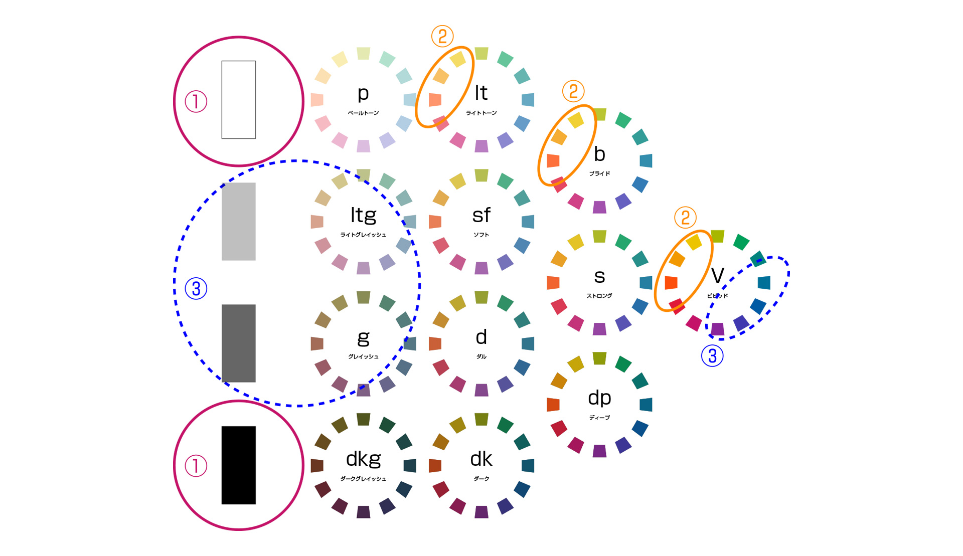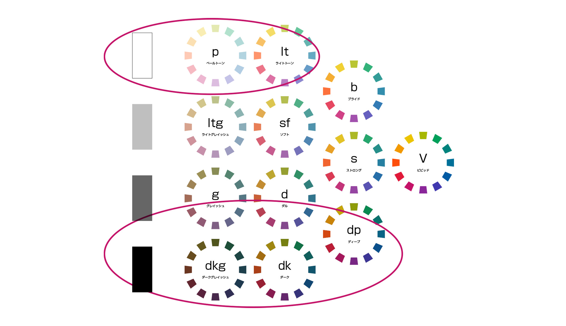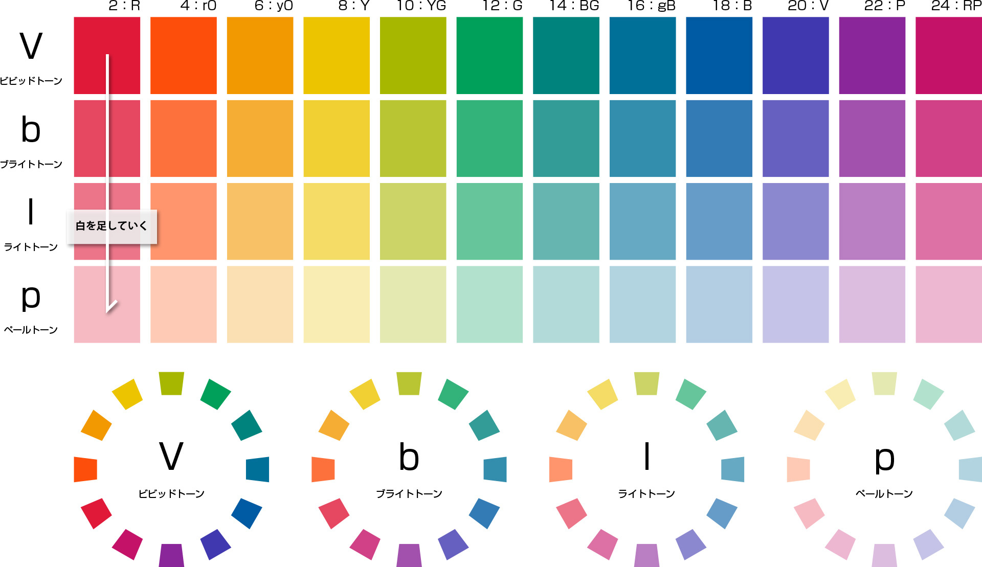 さらに白の量を増やすとライトトーン、もっと増やすとペールトンの色相環になります