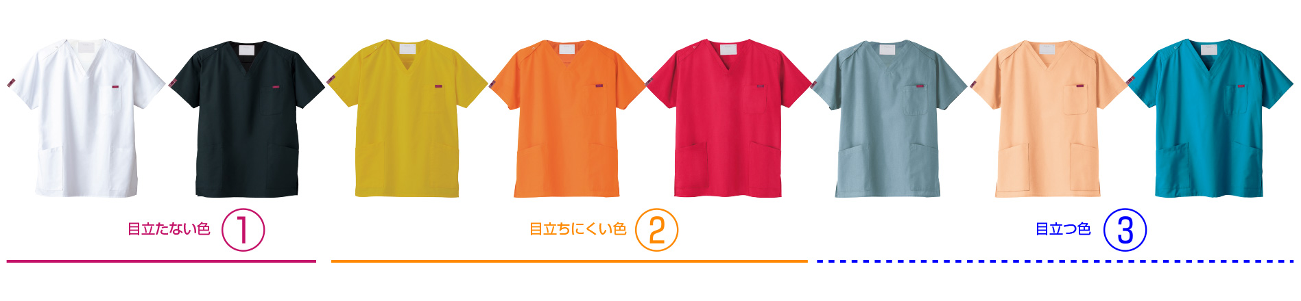 それだけでなく着用者である医療従事者にとっても、汗かきなら汗染みの目立たない色選び、下半身をすっきり見せたいなら上半身に膨張色を持ってくるようなスクラブクラブの色選び、肌の色に似合った色選び、下着の色柄が透けて見えない色選びなど、生理的心理的にしっかり考慮した色選びができるようになります。