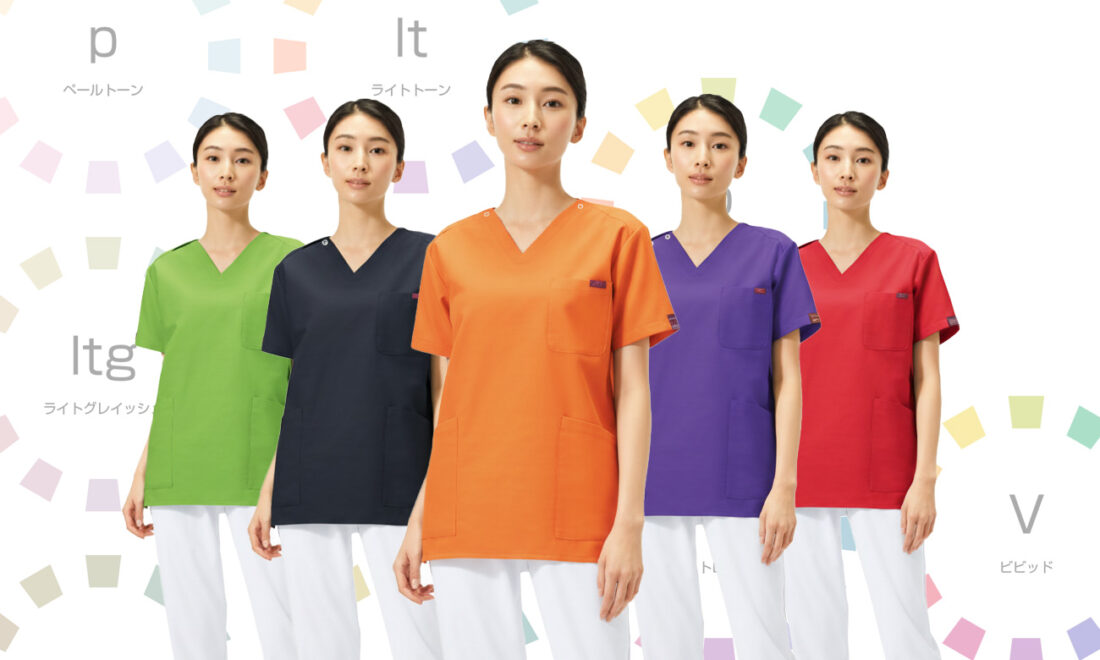 それだけでなく着用者である医療従事者にとっても、汗かきなら汗染みの目立たない色選び、下半身をすっきり見せたいなら上半身に膨張色を持ってくるようなスクラブクラブの色選び、肌の色に似合った色選び、下着の色柄が透けて見えない色選びなど、生理的心理的にしっかり考慮した色選びができるようになります。