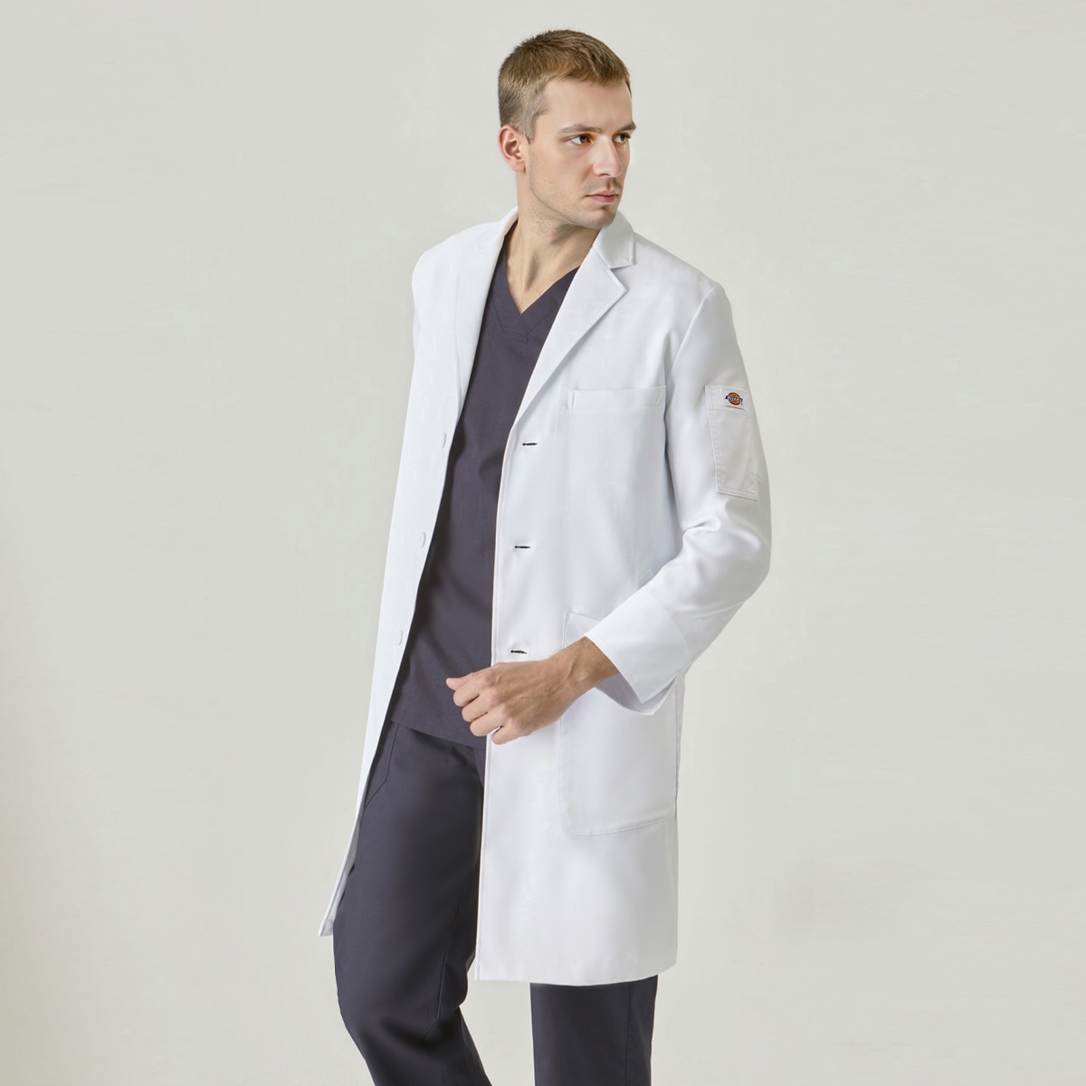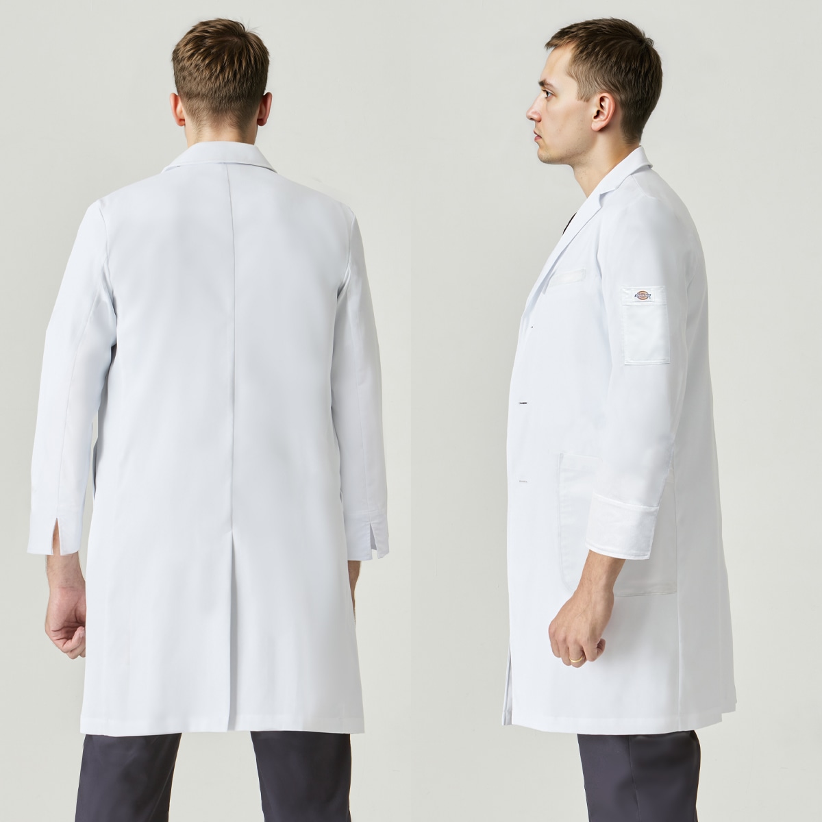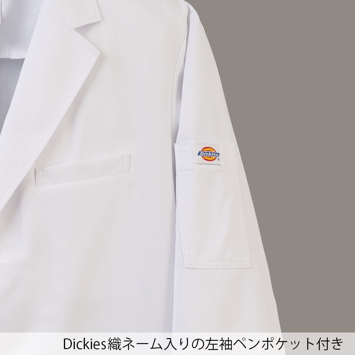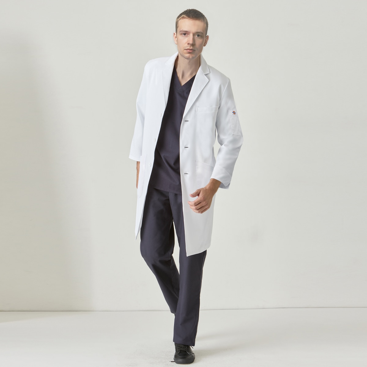 Dickies(ディッキーズ)シリーズのメンズシングルコート。綿混素材ながら、高ストレッチ・軽量・ソフトな手触りを実現し、快適な着心地を追求しました。V開きの襟元はDickiesスクラブとの相性抜群で、後ろベンツ仕様により動きやすさや足さばきにも配慮。綿タッチのナチュラルな質感は、幅広い年齢層にマッチします。さらに収納面も充実。両腰と左内側にはタブレットが収まる大容量ポケット、右腰ポケット内側にはスマホ収納ポケットを配置。さらに左胸と左袖にはペンポケットを備え、ワークシーンに必要な機能性をしっかりカバーします。 右カフス裏の3色ピスネームや左袖のDickies織ネームなど、さりげないオシャレなアクセントも魅力。機能性とデザイン性を両立し、着る人を引き立てるスタイリッシュなドクターコートです。