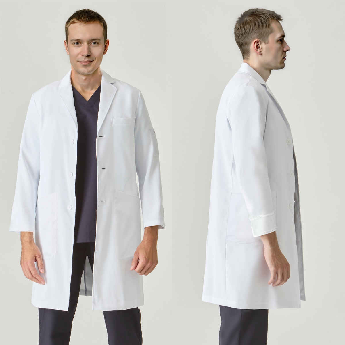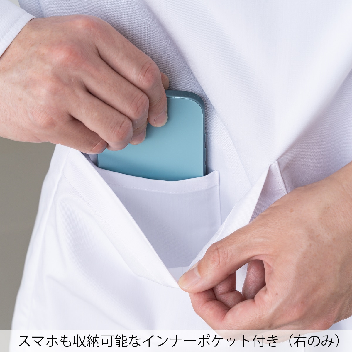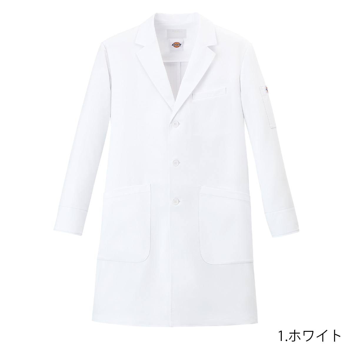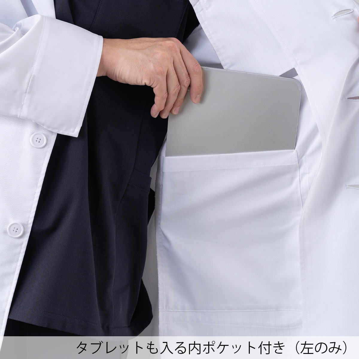 Dickies(ディッキーズ)シリーズのメンズシングルコート。綿混素材ながら、高ストレッチ・軽量・ソフトな手触りを実現し、快適な着心地を追求しました。V開きの襟元はDickiesスクラブとの相性抜群で、後ろベンツ仕様により動きやすさや足さばきにも配慮。綿タッチのナチュラルな質感は、幅広い年齢層にマッチします。さらに収納面も充実。両腰と左内側にはタブレットが収まる大容量ポケット、右腰ポケット内側にはスマホ収納ポケットを配置。さらに左胸と左袖にはペンポケットを備え、ワークシーンに必要な機能性をしっかりカバーします。 右カフス裏の3色ピスネームや左袖のDickies織ネームなど、さりげないオシャレなアクセントも魅力。機能性とデザイン性を両立し、着る人を引き立てるスタイリッシュなドクターコートです。