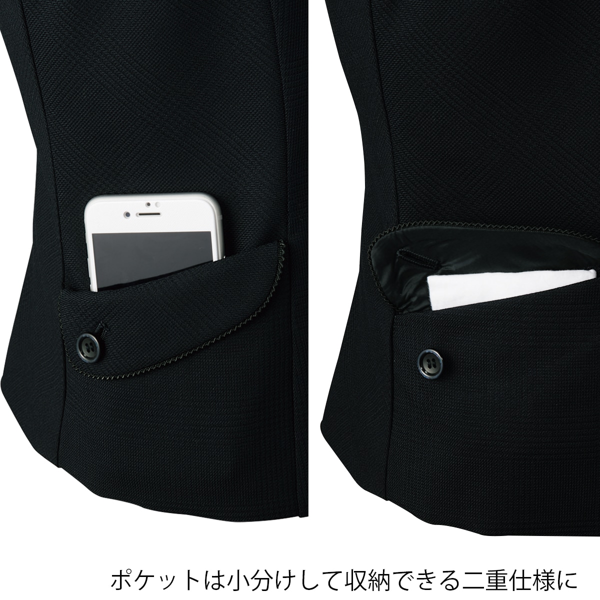 上質なおもてなしにふさわしいスーツシリーズのベスト。サイドのバイヤス切替が細見え効果を発揮。女性らしいシルエットを演出してくれます。ポケットは小分けして収納できる二重仕様に。右内側には印鑑収納スペースも確保。背面にスリットを施すことで、見た目の美しさと着心地の良さを追求しました。収納力抜群で細見え効果も叶える事務服ベストです。