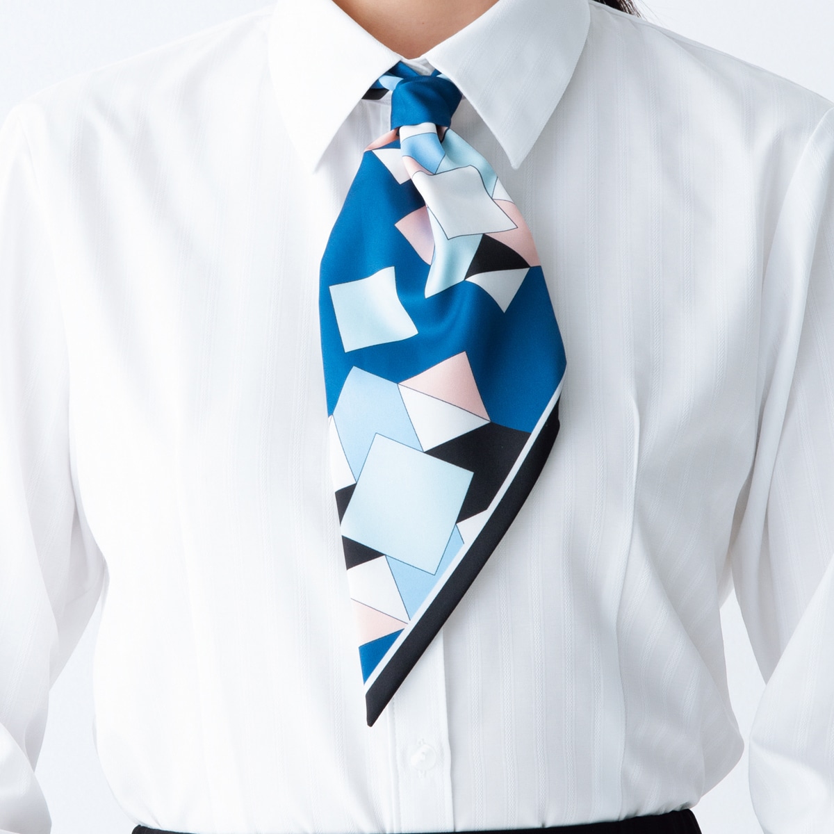 首元がカンタンにパッと華やぐスカーフです。便利なループが付いたスカーフです。自分流のアレンジが楽しめます。顔まわりを明るく見せる地味すぎず、派手すぎない印象的な柄がアクセント。お手持ちのスーツやジャケットに1点加えるだけで印象が大きく変わります。リボン巻き、ネクタイ風、クロスリボンと3WAYで使え、結び方次第で変化も楽しめるので、おしゃれの幅も広がります。華やかかつ爽やかさを演出できるスカーフです。