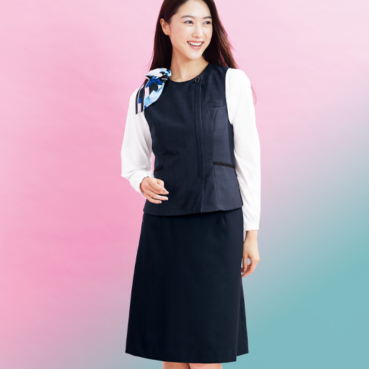 事務服の定番、オフィスユニフォームには欠かせないスカート。ベストの時もオーバーブラウスの時でもデザインなマッチしたスカートを着用すればキチンと感もアップします。